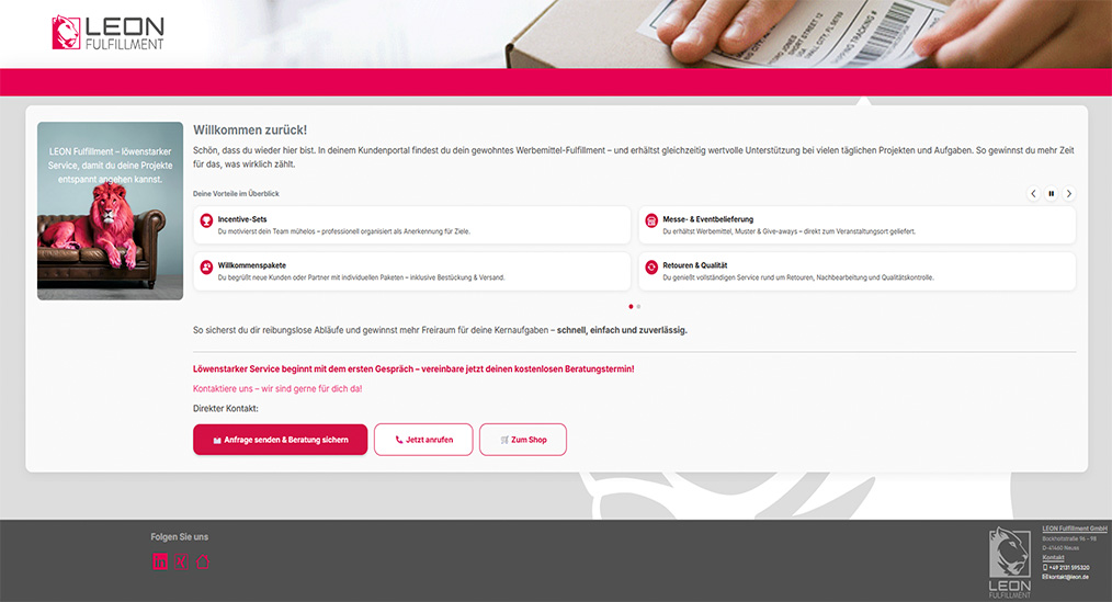 Wir haben aus Ihrer täglichen Nutzung gelernt und den LEON Shop konsequent weiterentwickelt. Was früher getrennte Systeme, manuelle Schritte und starre Oberflächen waren, ist heute ein flexibles, intelligentes Cockpit, das alles verbindet, was moderne Markenlogistik braucht.